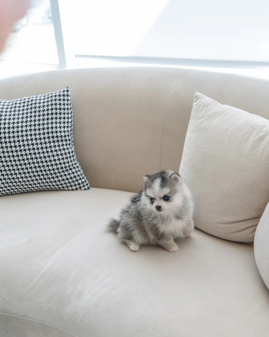 BREED: POMSKY NAME: AZURE SEX: FEMALE COLOR: SILVER & WHITE AGE: 3MONTHS